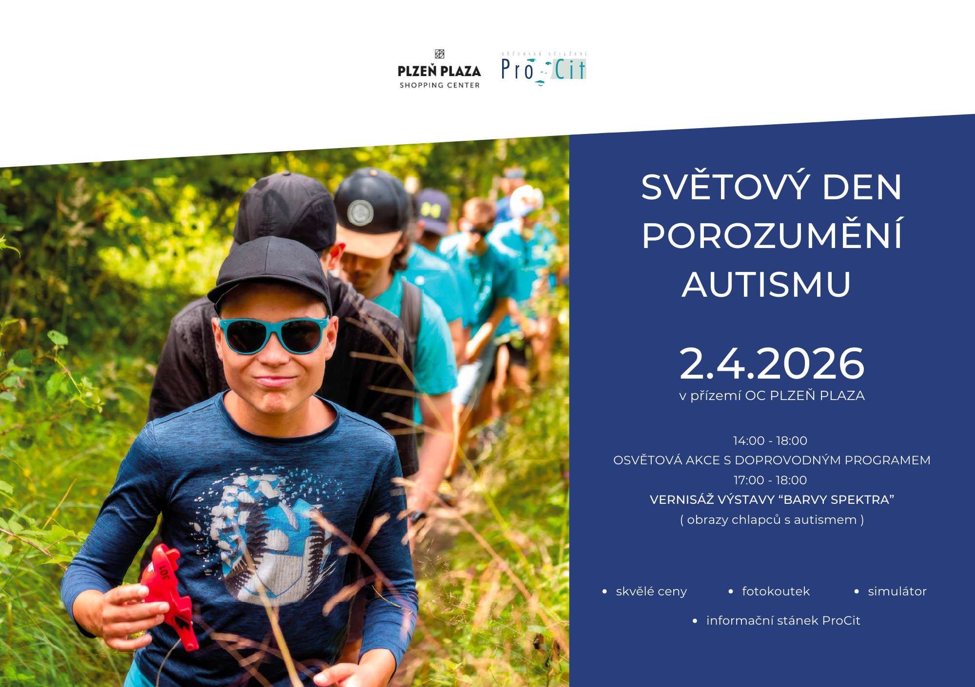 Občanské sdružení ProCit ve spolupráci s obchodním centrem Plzeň Plaza připravuje osvětovou akci u příležitosti Světového dne porozumění autismu. Uskuteční se 2. dubna 2026 od 14:00 do 18:00 hodin v prostorách obchodního centra u Starbucks.